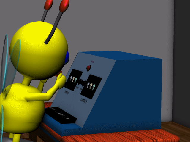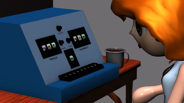 The custom-made machinery is described rather vaguely, and the pictures in the PDF are overexposed, so I had to guess at some details. I’m subbing an IBM 650 as the master sequencer and controller, supervised here by HappyStar. The master included a random number generator, sequencing relays, and a chart to record the response times.