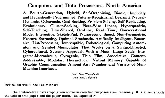 A Fourth-Generation, Hybrid, Self-Organizing, Bionic, Implicitly and Heuristically Programmed, Pattern-Recognizing, Learning, NeuralDynamic, Cybernetic, Goal-Seeking, Problem-Solving, Self-Replicating, Evolutionary, Cluster-Seeking, Piece-Wise Linear, Hyperquadric, Self-Teaching, Time-Shared, On-Line, Real Time, ConversationalMode, Interactive, Sketch-Pad, Nanosecond Speed, Non-Parametric, Feature Extracting, Optimal, Stochastic, Artifically Intelligent, Recursive, List-Processing, Interruptible, Robotological, Computing Automaton and Symbol Manipulator That Works on a Syntax-Directed, Cybercultural, Systems Approach With a Mass, Large Scale, Integrated-Microcircuit, Cryogenic, Thin Film, Associative , ContentAddressable, Modular, Hierarchical, Virtual Memory Capable of Graphic Communication Among Any Number and Variety of ManMachine Interfaces.
