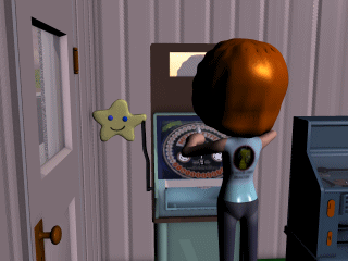 Polistra has inserted a coin. She turns the letter crank to form the message she wants, then HappyStar pulls the left lever to engrave each letter on the medallion. At the end Polistra pulls the right lever to finish off, and the coin is dispensed.